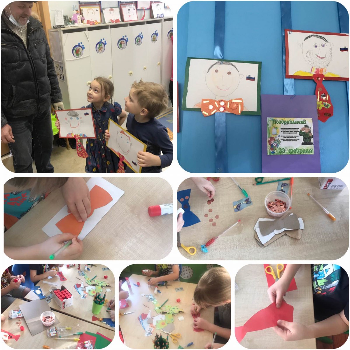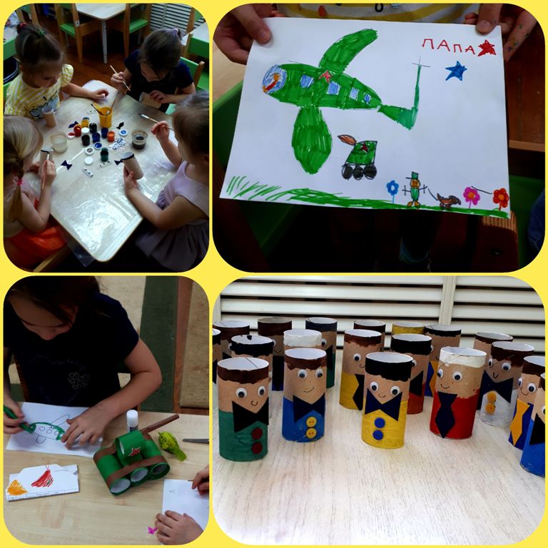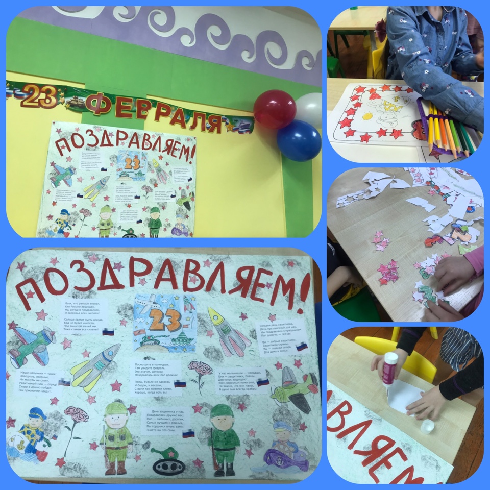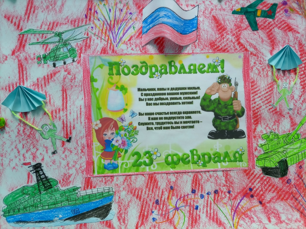 К середине недели девчата приготовили мальчиками яркую и красочную стенгазету с поздравлениями. Все вместе лепили весёлые вертолёты и готовили папам портреты.