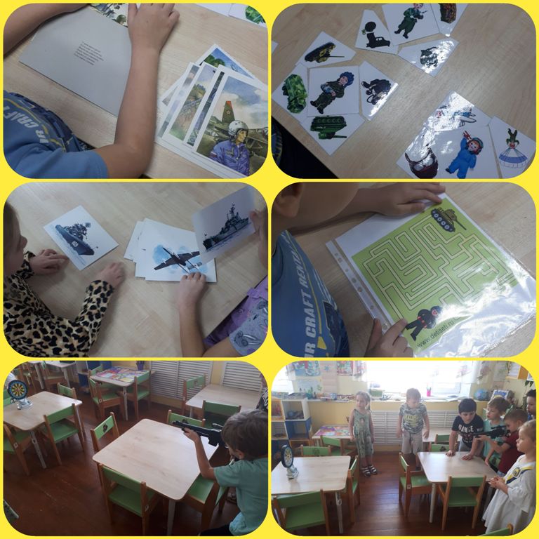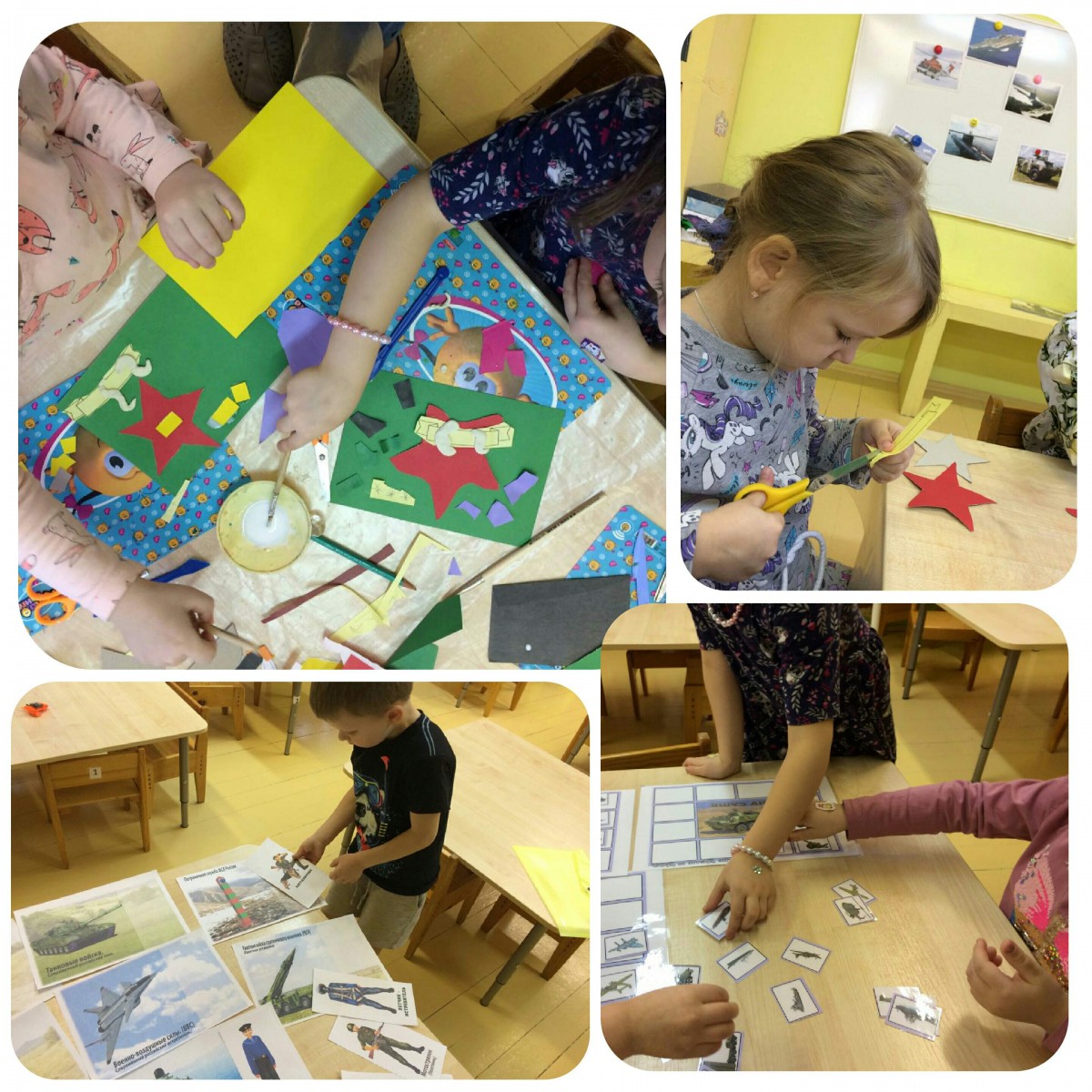 Воспитателями были построены беседы, темы которых звучали так :"Военная профессия", "Застава не спит","Солдатская кухня». Дети Рассматривали картины "Богатыри" Васнецова В.М., Совместно с воспитателями читали рассказа А. Митяева "Почему армия родная", русские народные сказки "Каша из топора", "Барин и солдатская шинель".