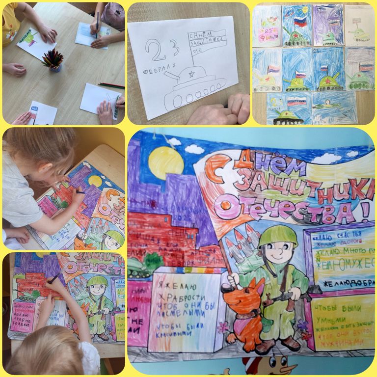 Неделя была очень насыщенной, ведь она была посвящена празднику 23 февраля дню Защитника Отечества. Необходимо было поздравить любимых пап: сделать для них подарки, подготовить поздравительную газету. Кроме этого, беседовали с ребятами о Защитниках Отечества, о подвигах и героях. Творчество было посвящено военной технике.