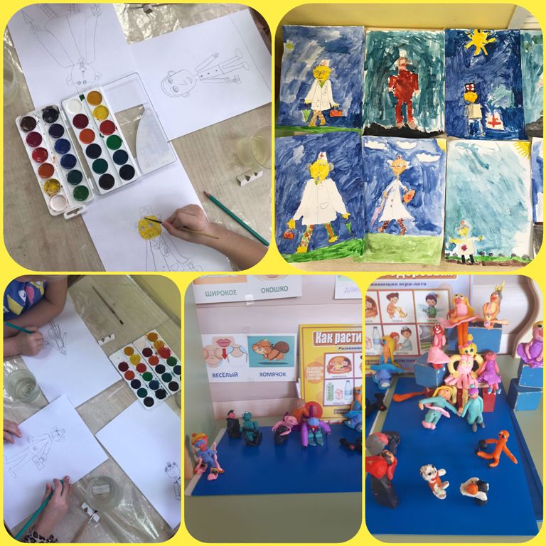 Обогащали уже имеющиеся знания рассказами из личного опыта, читали рассказ "Человек заболел" И. Туричина. После прочтения рассуждали о страхах, отваге и героических поступках, о профессии врач. В рисунках у ребят самый добрый доктор Айболит спешил на помощь.