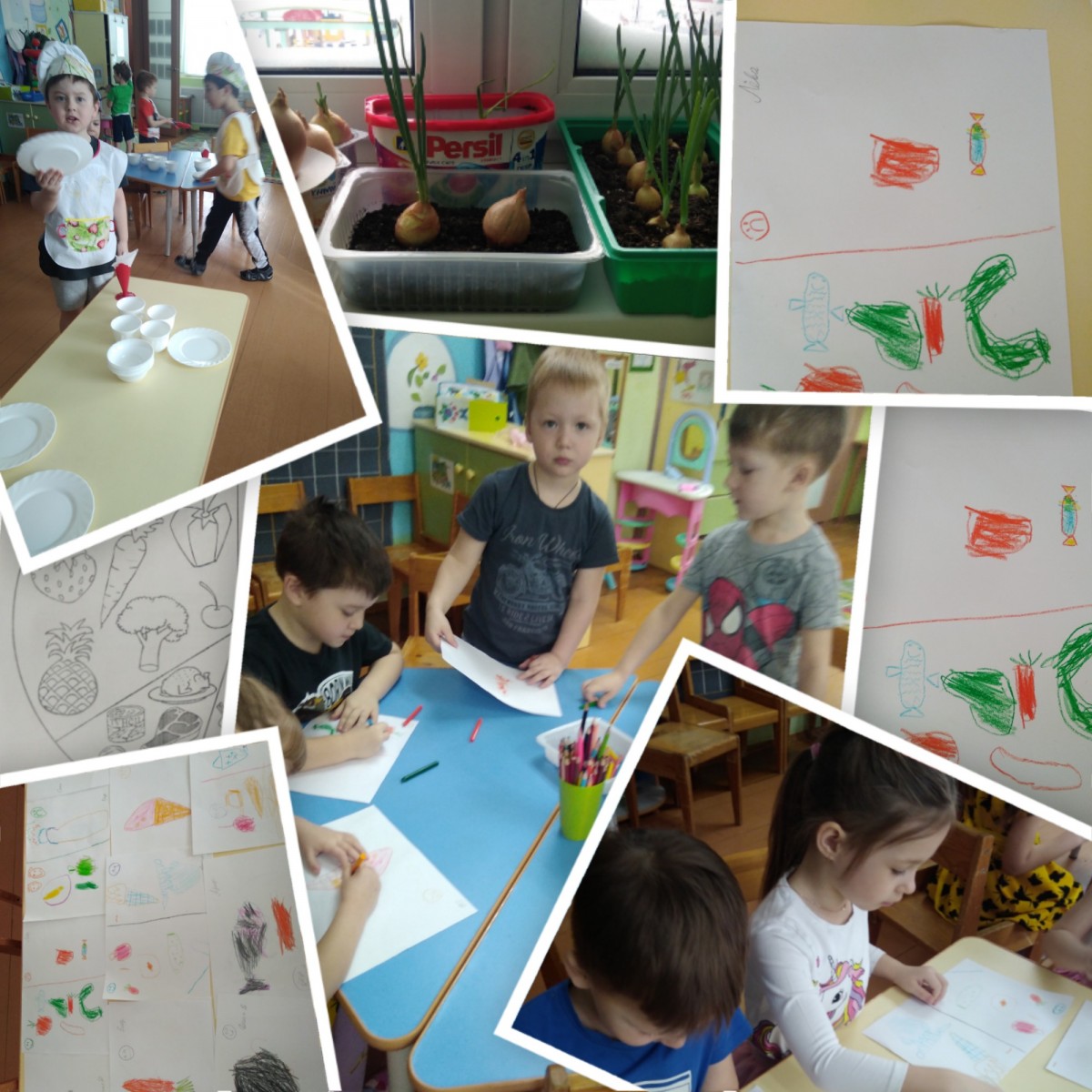 Неделя Здоровья в группе Журавлик была посвящена правильному питанию. Не секрет, что дети любят сладкое и не очень любят полезные овощи и зелень. Другое дело - листовая зелень, выращенная своими руками. Чтобы больше узнать о посаженных растениях, ребята посмотрели про них презентацию, отгадывали загадки. Салат уже пересадили в горшочек, а огурчики, у которых появился первый настоящий лист, в большое ведёрко. Потом ребята рисовали полезные продукты, сразу решив, что конфеты, пиццу сосиски и чипсы мы рисовать не будем, а если тортик-то только овощной!