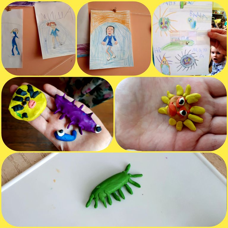 Вот и группа "Солнышко" решила, что надо стараться здоровье сохранять и укреплять . Задумались, а какие они слагаемые здоровья? Режим, правильное питание, сон, свежий воздух, занятие спортом, гигиена и , конечно, хорошее настроение! Решили, что эти вполне выполнимы, особенно в детском саду. Ну а как без игр, творчества и таких любимых экспериментов. С удовольствием познакомились с героем сказки Г. Остера "Петька-микроб", узнали, что микробы бывают и полезные, стихотворение В.Бредихина "Раз микроб, два микроб" заставило рассмеяться и внимательно посмотреть на ногти. А сколько творчества проявили, когда фантазировали из пластилина таких разных микробов! Даже целые семьи бросились рисовать! Эксперимент по борьбе мыла с грязными руками вызвал бурю восторга, когда увидели, как грязь и микробы разбегаются от маленькой капли мыла. Твёрдо решили продемонстрировать его дома и ....отправились мыть руки с соблюдением всех правил. На прогулках и любимые лыжи, и труд на свежем воздухе(подкинула зима работы в этом году). Но розовые щеки и хорошее настроение-показатель здорового организма! Режим дня и правильное питание в детском саду -это основа основ. Игры помогали закреплять вредное и полезное для здоровья, а сон восстанавливать силы. Старания наших ребят удались!