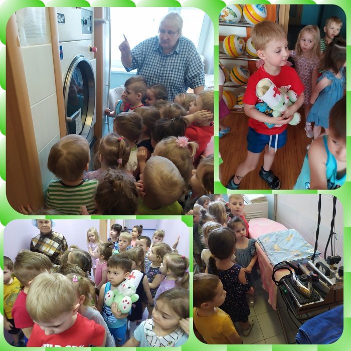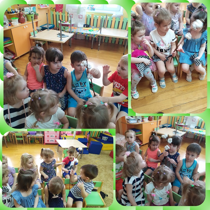 На этой неделе ребята из группы Теремок отправились на экскурсию по детскому саду вместе с кроликом Здоровейкой. Малыши узнали, где и как в детском саду заботятся об их здоровье. Особенно ребятам понравилось в прачечной, где стирают для них постельное белье и полотенца. Повара готовят полезные и вкусные блюда, в медицинском кабинете делают кислородные коктейли и ставят прививки, необходимые, чтобы не заболеть. В физкультурном зале все ребята закаляются и укрепляют здоровье физкультурой. Здоровейка принес малышам волшебный мешочек, который помог ребятам узнать, что бывают полезные сладости — фрукты и ягоды.Мы посадили на подоконнике укроп, салат и щавель, сьедобные и полезные растения, и уже увидели всходы. Первым взошел салат-руккола. Еще, благодаря маме Никиты, которая принесла нам настоящие коробочки хлопка, мы узнали, как и из чего делают футболочки, носочки и шортики для ребят.