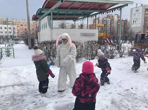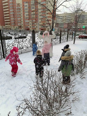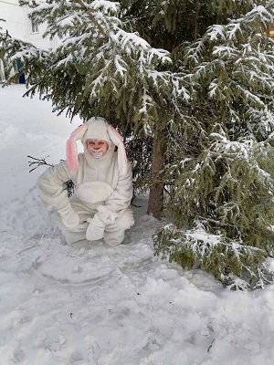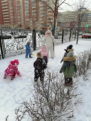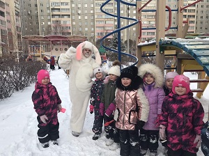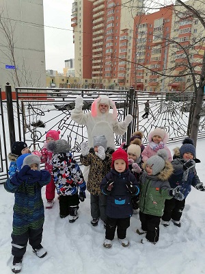 На кануне Нового года в гости к воспитанникам нашего детского сада пришел Зайчишка, длинноухий шалунишка. Он поиграл со всеми группами на улице в снежки, подвижные игры. Детки показали ему нашу территорию и он довольный отправился к себе домой в лес.