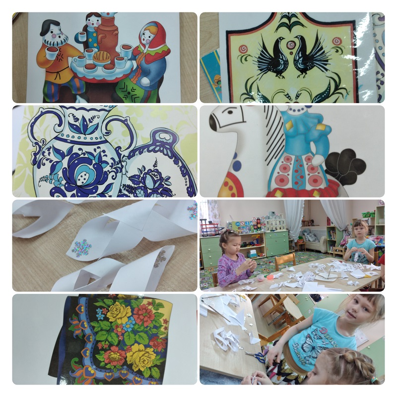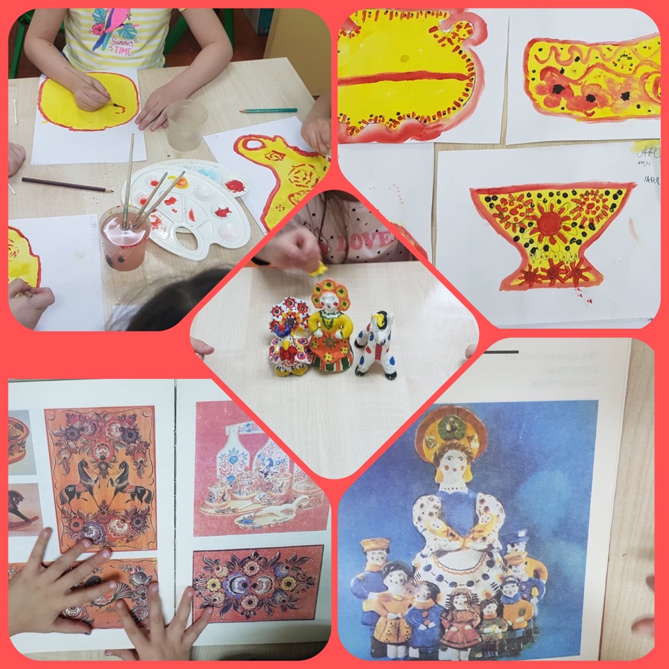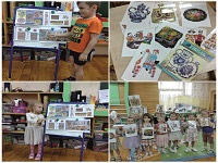 В течение недели мы рассматривали альбомы с различными росписями: Хохлома, Гжель, Городецкая роспись. В нашей группе есть отдельный уголок посвящённый данной теме. Ребята постоянно интересуются игрушками которые были раньше, спрашивают какая была первая посуда.Для родителей мы также организовали небольшую информацию в приемной, где они могли узнать чем мы занимаемся в течение недели. Ребята научились разрисовывать игрушки и посуду различными росписями, оставались всегда довольными что работы получаются такими яркими и красочными.
