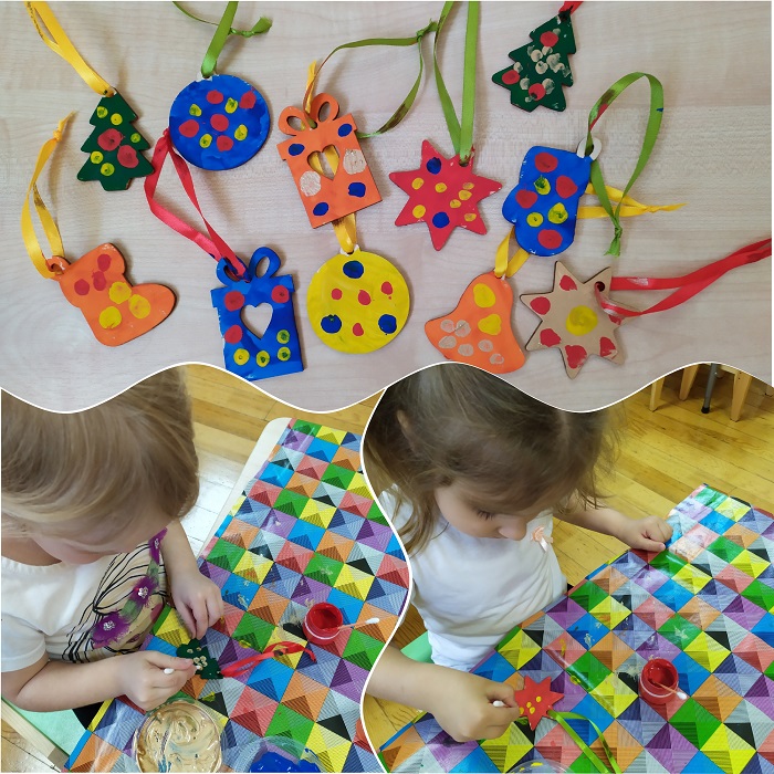 На этой неделе малыши из группы Теремок попробовали себя в роли мастеров. Сначала ребята изучали узоры дымковской игрушки и разрисовывали лошадок большими и маленькими кружочками. А потом сами сделали елочные игрушки. Это была долгая работа. Сначала выбирали деревянные заготовки в форме шариков, звездочек, рукавичек… Потом покрывали краской любимого цвета. При помощи ватных палочек рисовали узор, похожий на традиционный для дымковской игрушки орнамент из кругов. Чтобы игрушка получилась по-настоящему новогодней, покрывали ее клеем и посыпали блестками. Каждый унес домой на свою елочку красивую игрушку, сделанную своими руками.Спасибо маме Ксюши за предоставленные заготовки!
