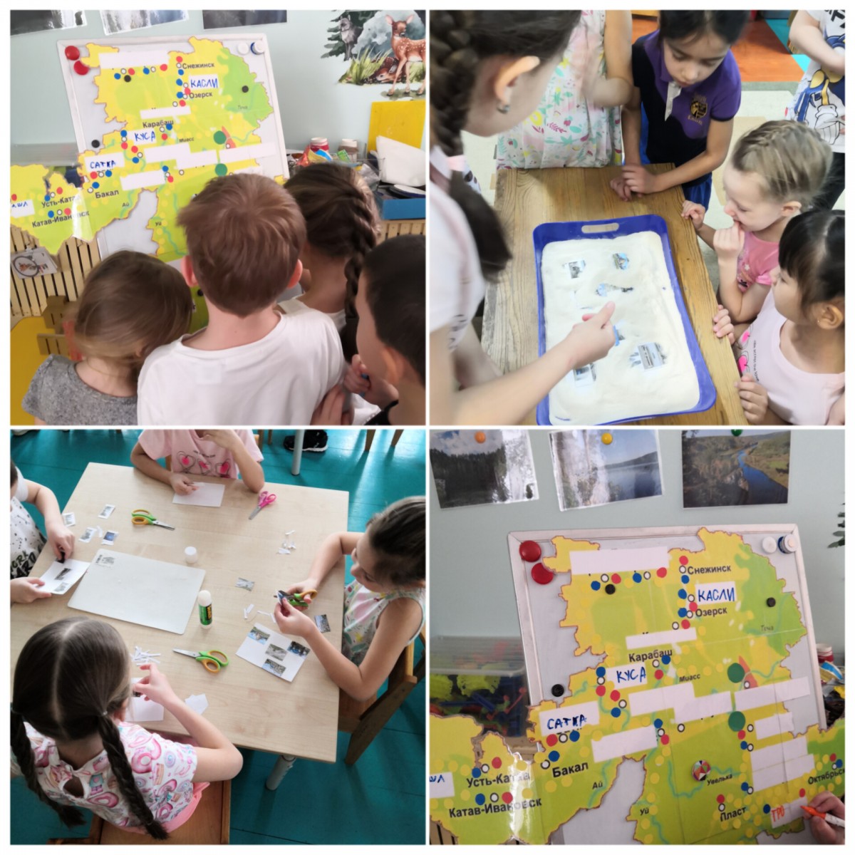 По теме недели" Уральский край родной " ребятам в группе Росинка рассказывали, что живут на Южном Урале, в центре России. Город Челябинск- это столица Южного Урала. На карте показывали расположение нашей Челябинской области, находили реки, озера и города. Рассматривали коллекцию минералов и горных пород, играли в дидактические игры. Ребята выполнили обрывную аппликацию на тему "Наша Уральская природа ".А также из бросового материала сделали высокую гору"Народную" и слепили туристов,после обыграли сюжет.