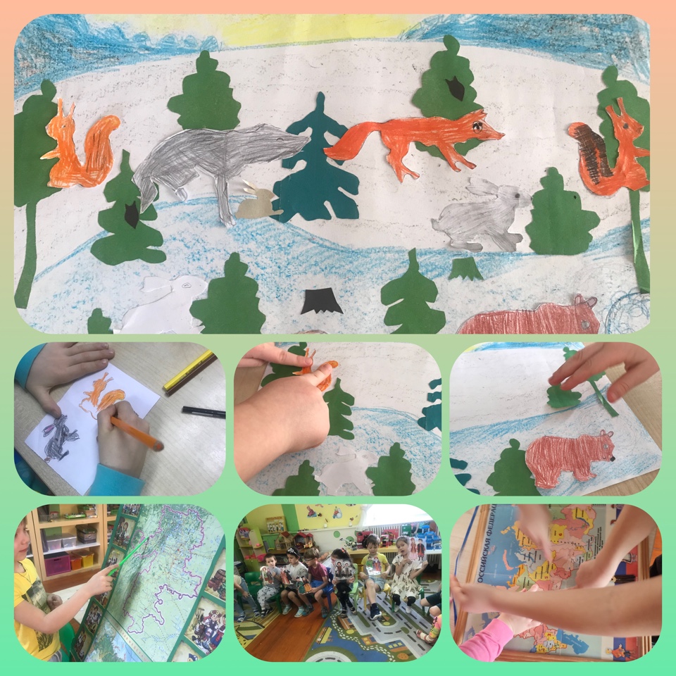 По теме неделе «Уральский край родной» воспитатели беседовали с детьми о том, что мы живем на Южном Урале, который расположен в центре России. Нашли на карте расположение Челябинской области, убедились что наш край родной богат разнообразием озёр, рек, гор, лесов… Выполнили с ребятами комплексную работу «Уральские горы» с элементами обрывной аппликации и рисованием акварели. А также познакомили детей с историей заселения Южного Урала людьми. Узнали что в нашем краю живут много людей разной национальности. Поговорили о том, что в наших лесах обитает много животных. Выполнили с ребятами коллективную композицию « Животные наших лесов».