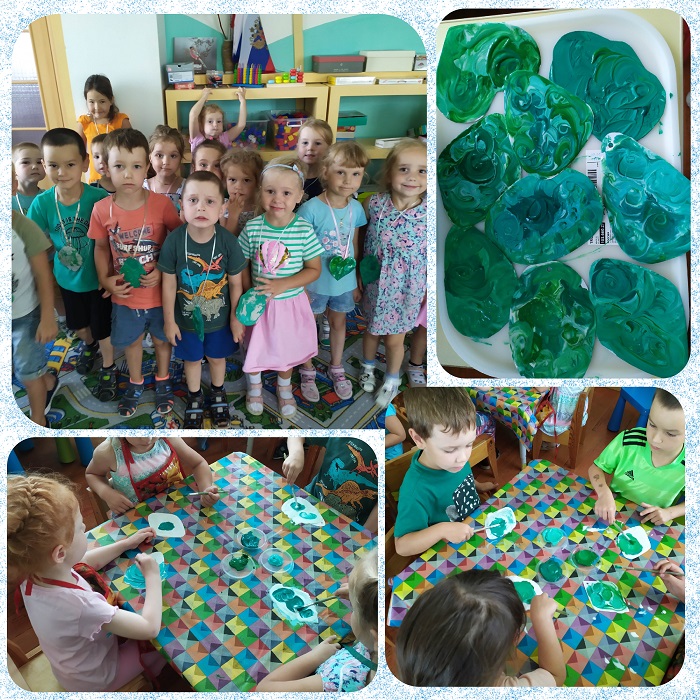 На прошедшей неделе, посвященной народным промыслам Урала, ребята знакомились с искусством Уральских камнерезов. Когда-то Урал славился добычей первосортного малахита. Мы с ребятами изготовили кулон с малахитовыми узорами. Смешивали в разных пропорциях синюю, желтую и белую краску, получая различные оттенки зеленого, выбирали форму будущего кулона, грунтовали клеем ПВА и выполняли узор в технике рисования по грунту. Своим опытом создания малахитовых узоров группа Журавлик поделилась со всеми группами детского сада, каждый ребенок от малыша до выпускника смог сделать такой кулон, ведь техника рисования по грунту проста и доступна.
