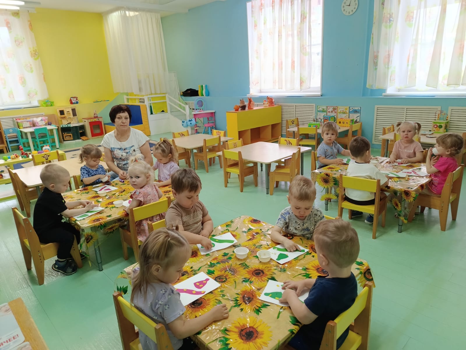 С ребятами группы Вишенка вспомнили строение человека, провели беседу по картинкам. Лепили человека. Выполнили аппликацию подсолнух. Все были довольны своей работой.