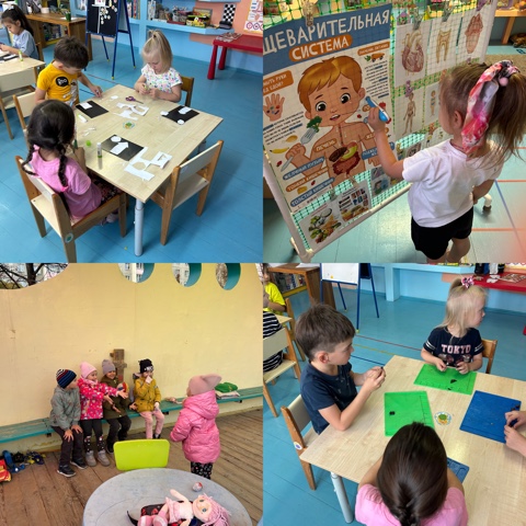 Подготовительная группа Вишенка. На занятии по развитию речи беседовали по картине Строение человека. Прочитали стихи. Выполнили аппликацию Здоровые зубки. Лепили человечиков.
