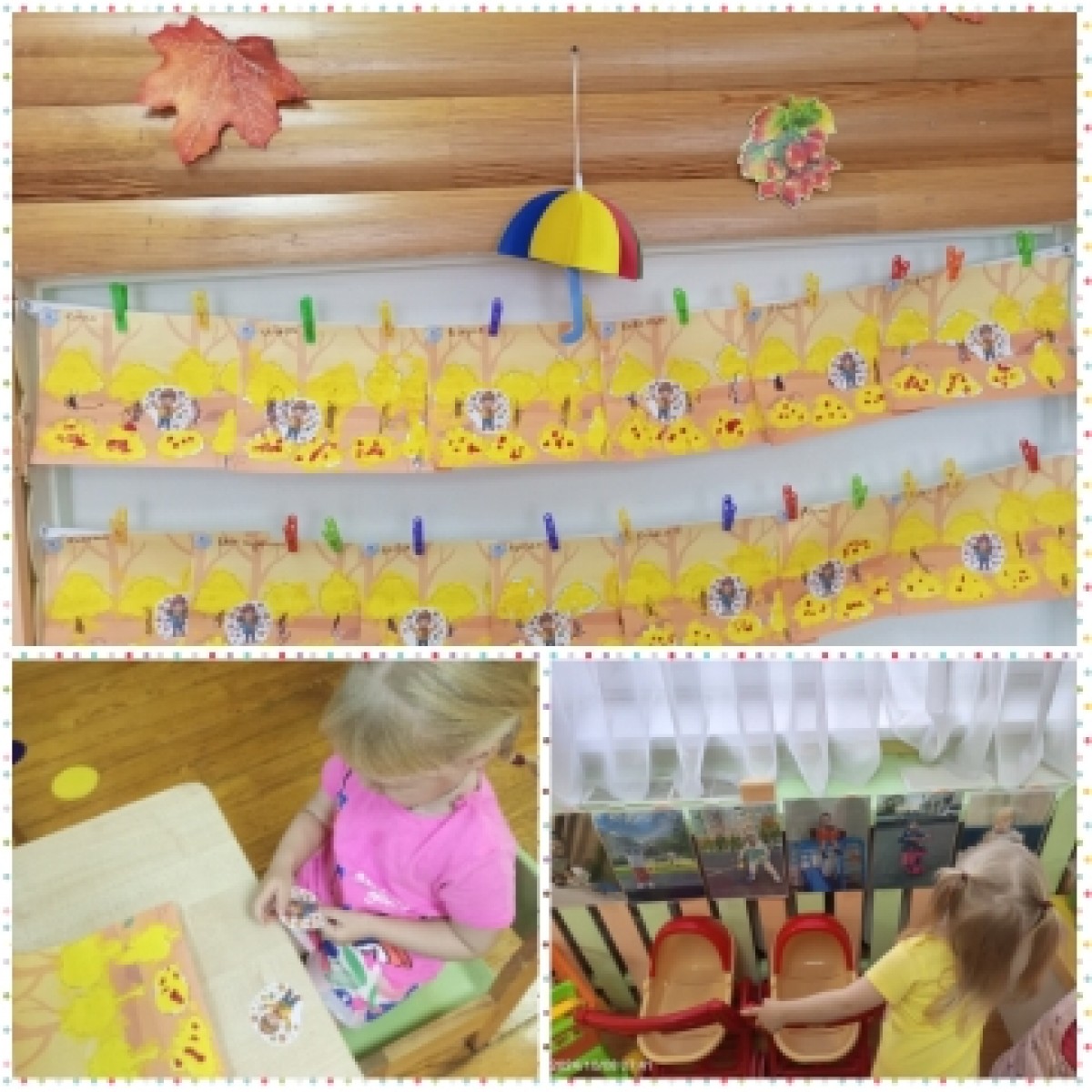 А в наших творческих работах еще золотая осень, у девочек по осеннему лесу гуляют девочки, у мальчиков - играют листиками мальчики.