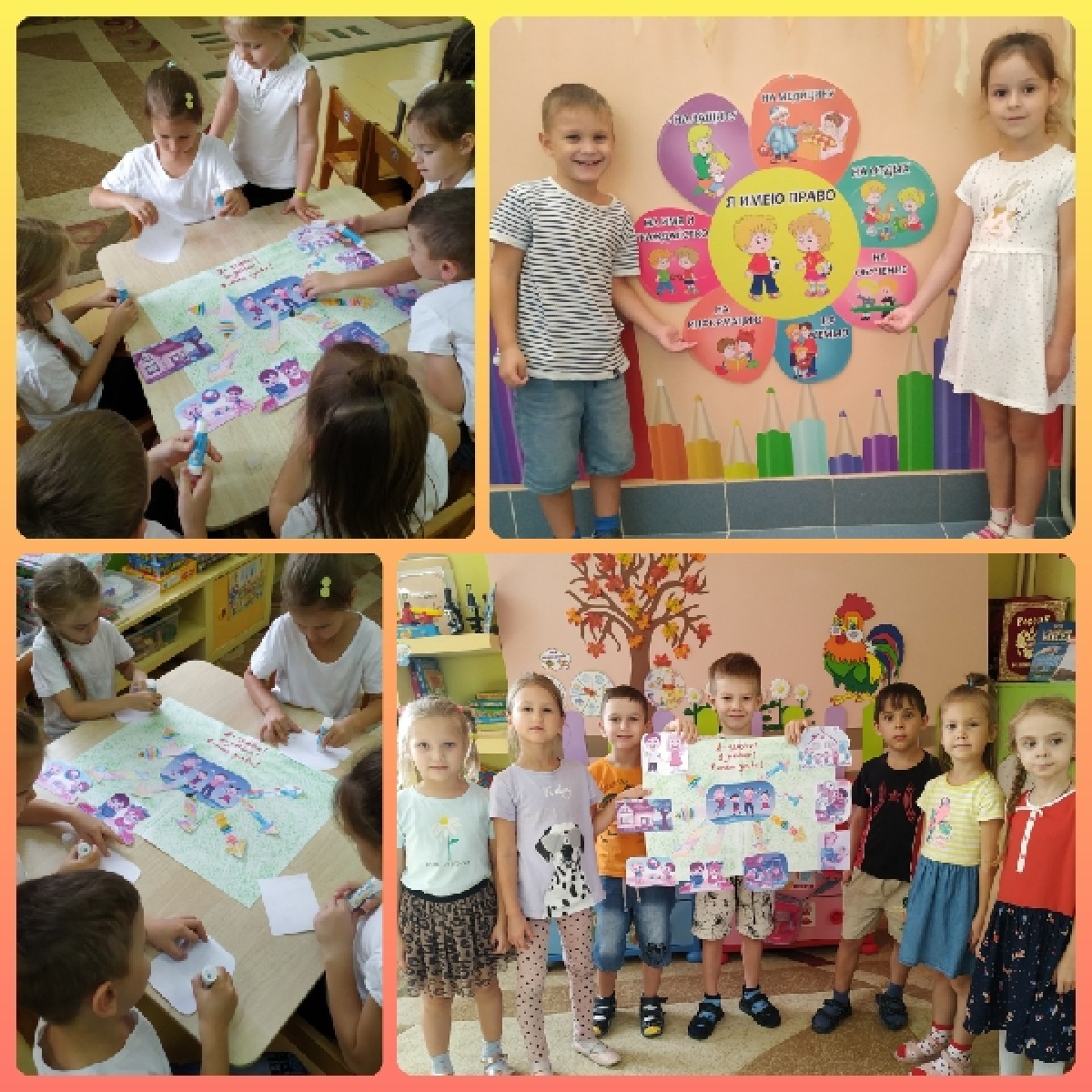 С ребятами мы выясняли у каких сказочных героях были нарушены права, так в сказке "Три поросенка" - право на неприкосновенность жилья, в сказке "Айболит" - право на здоровье, а " Заюшкина избушка" определила право на жилье. В конце мероприятия дети сделали коллективный плакат "Права ребенка"