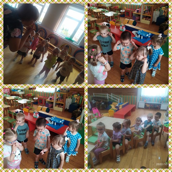 Так же малыши знакомились с частями тела. Под весёлые песенки находили у себя ушки, ручки и ножки. А где же носик? Да вот же он!