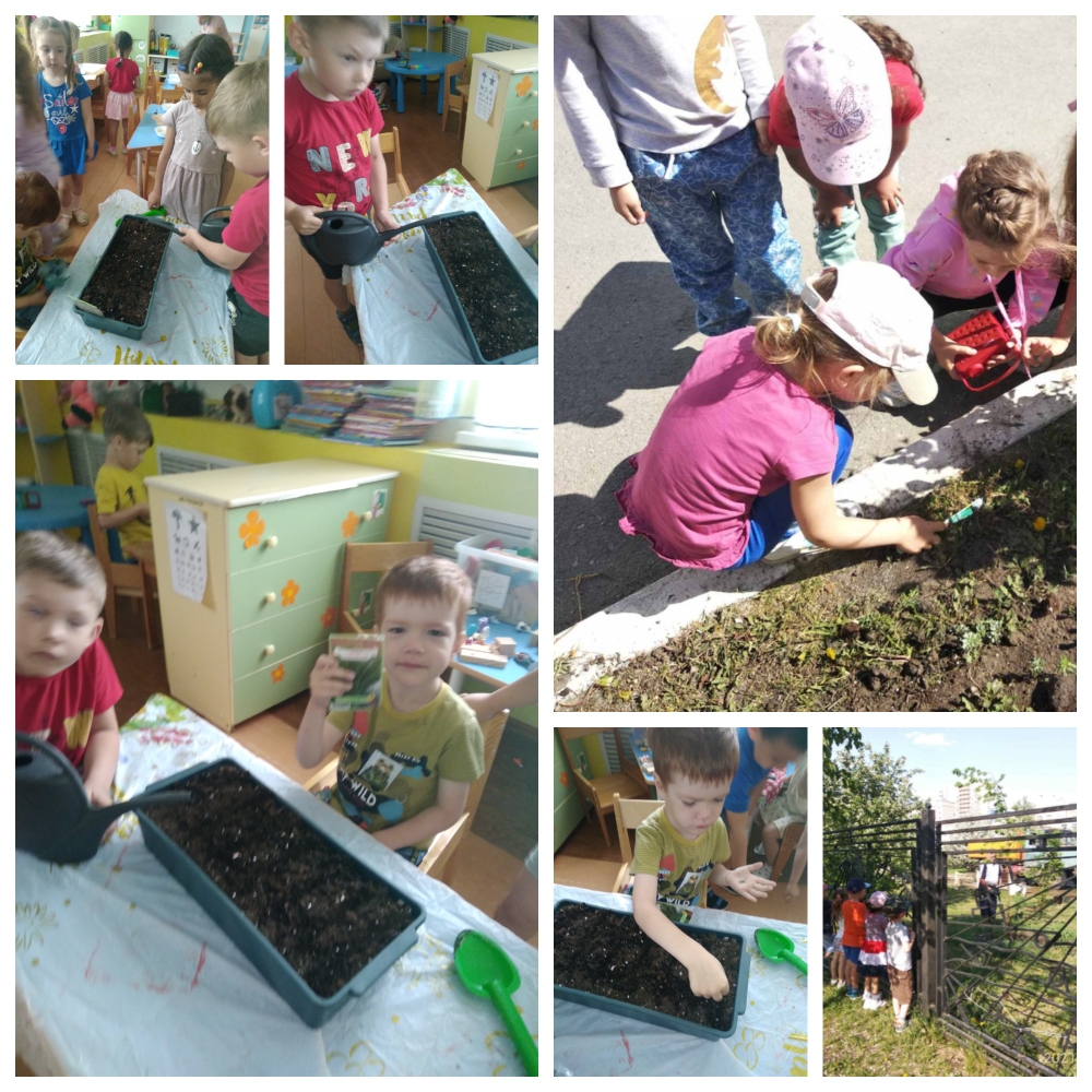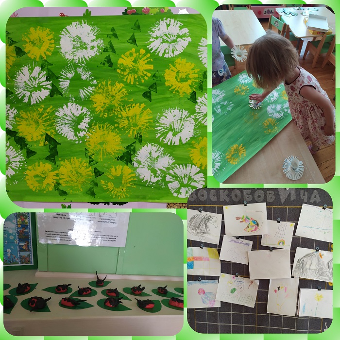 В творческих работах мы изображали то, что увидели на прогулке: поляну золотых и белых одуванчиков, божьих коровок, ворону и бабочку. Ждем, когда расцветут посаженные ребятами бархатцы и подсолнухи, на которых уже есть бутоны.