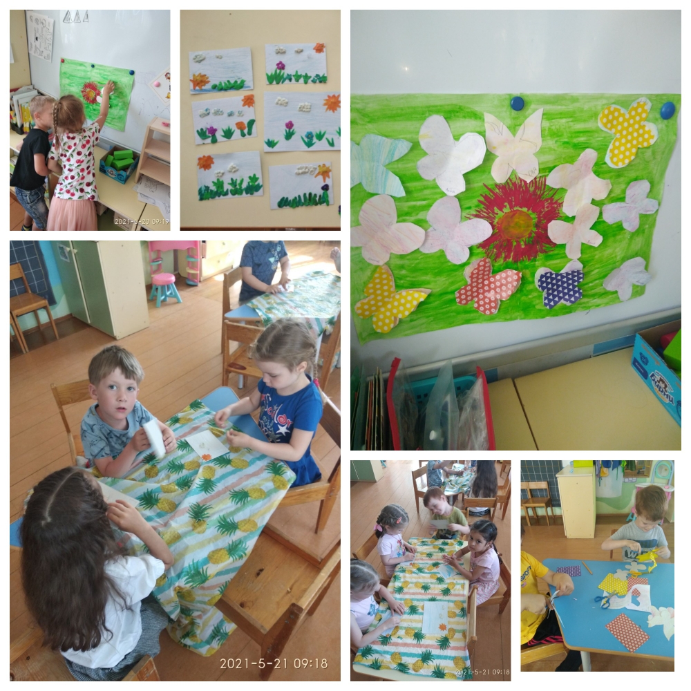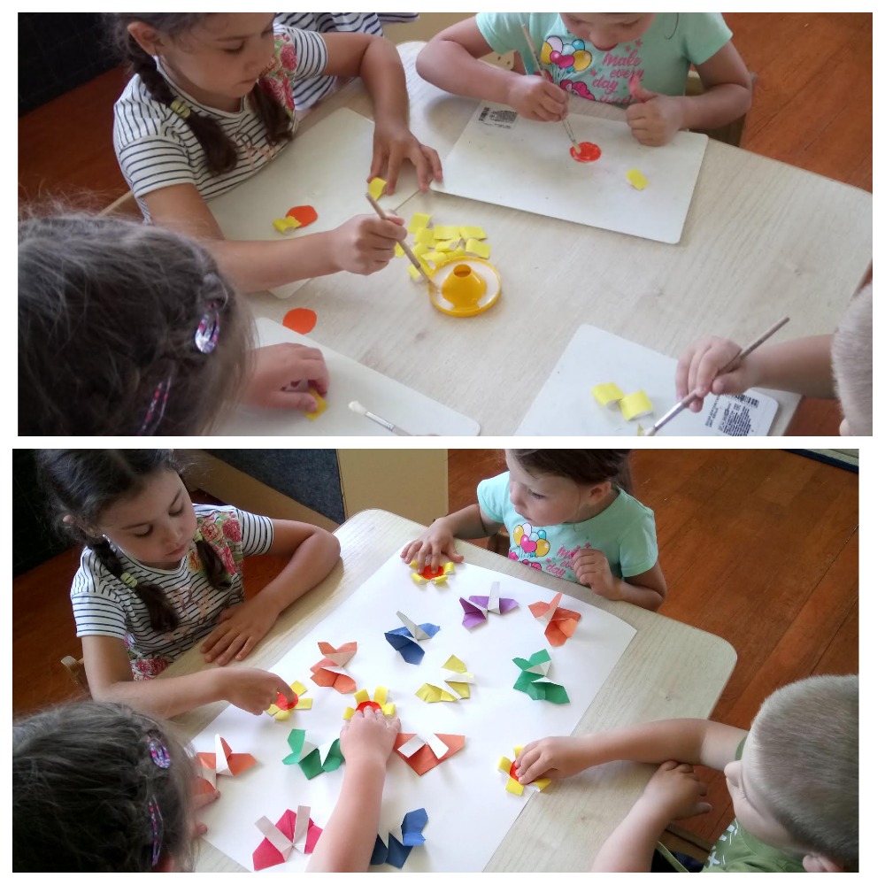 Захотели в группе Журавлик вспомнить на этой неделе насекомых. И вспомнили! А потом еще их нарисовали. Но мало им этого было. Захотелось еще и смастерить из бумаги красивых разноцветных бабочек. Бабочек смастерили Да как то скучно им без цветочков. Тогда ребята сделали коллективную работу. Кто-то вырезал кружки для цветов, кто-то прямые полоски, которые стали лепестками. А кто-то приклеил. И вот бабочки стали теперь порхать с цветочка на цветочек. А на прогулке как весело. Ведь есть большая раскраска, которую хватает на всех. И много разных игр.