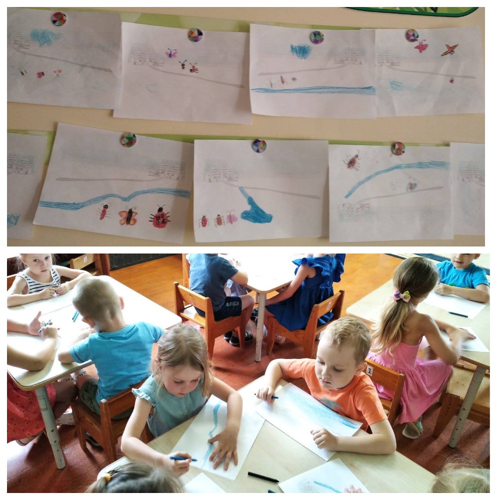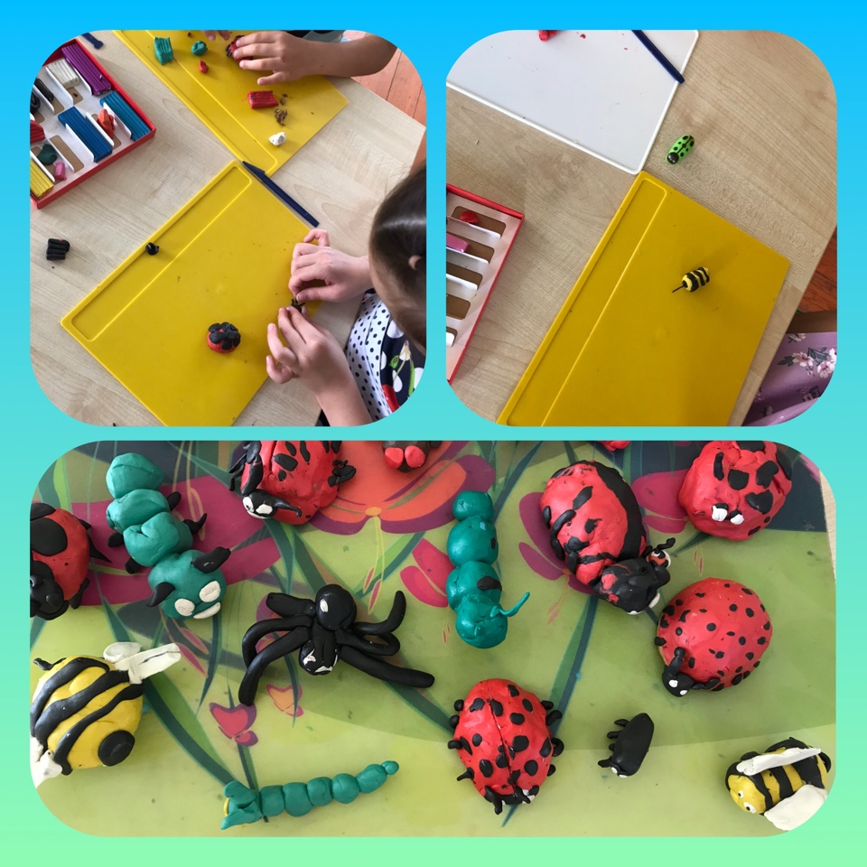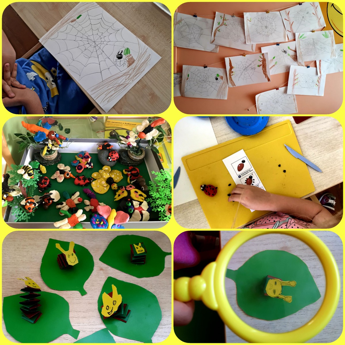 Погода баловала нас теплыми и даже жаркими днями, что позволило понаблюдать жизнь насекомых вживую. Столько восторга вызвал майский жук! Кто-то видел его в первый раз! Девочки строили детский сад для муравьишек, а мальчишки отправляли в полёт божьих коровок. Удалось понаблюдать даже ящерицу обыкновенную! Хоть она и питается насекомыми, но все же живой организм, поэтому с радостью поселили её на территории детского сада. Все наши наблюдения и знания нашли отражения в играх и творчестве. Наши дети точно знают, что паук не насекомое, но питается ими. Лесные "кружева" паутинки оживали на рисовании, а какой получился веселый жужжащий луг после лепки. Ну как же без гусениц, учились складывать бумагу новым способом "гармошкой"из двух полосок. Впереди лето, а значит знакомство с этим миром продолжится!