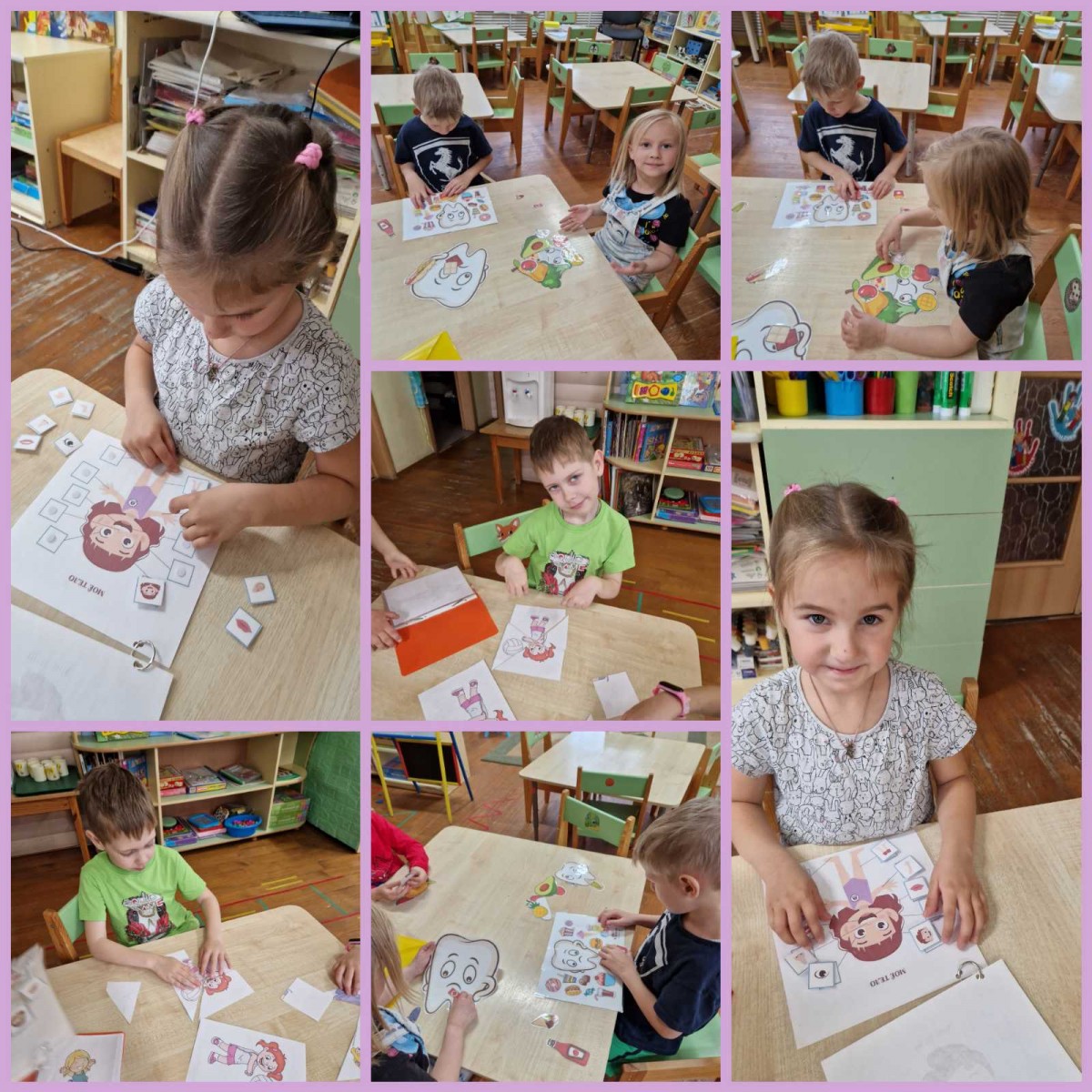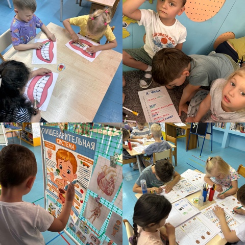 Подготовительная группа Вишенка. На занятии по развитию речи беседовали по картине Строение человека. Прочитали стихи. Выполнили аппликацию Здоровые зубки. Лепили человечиков.