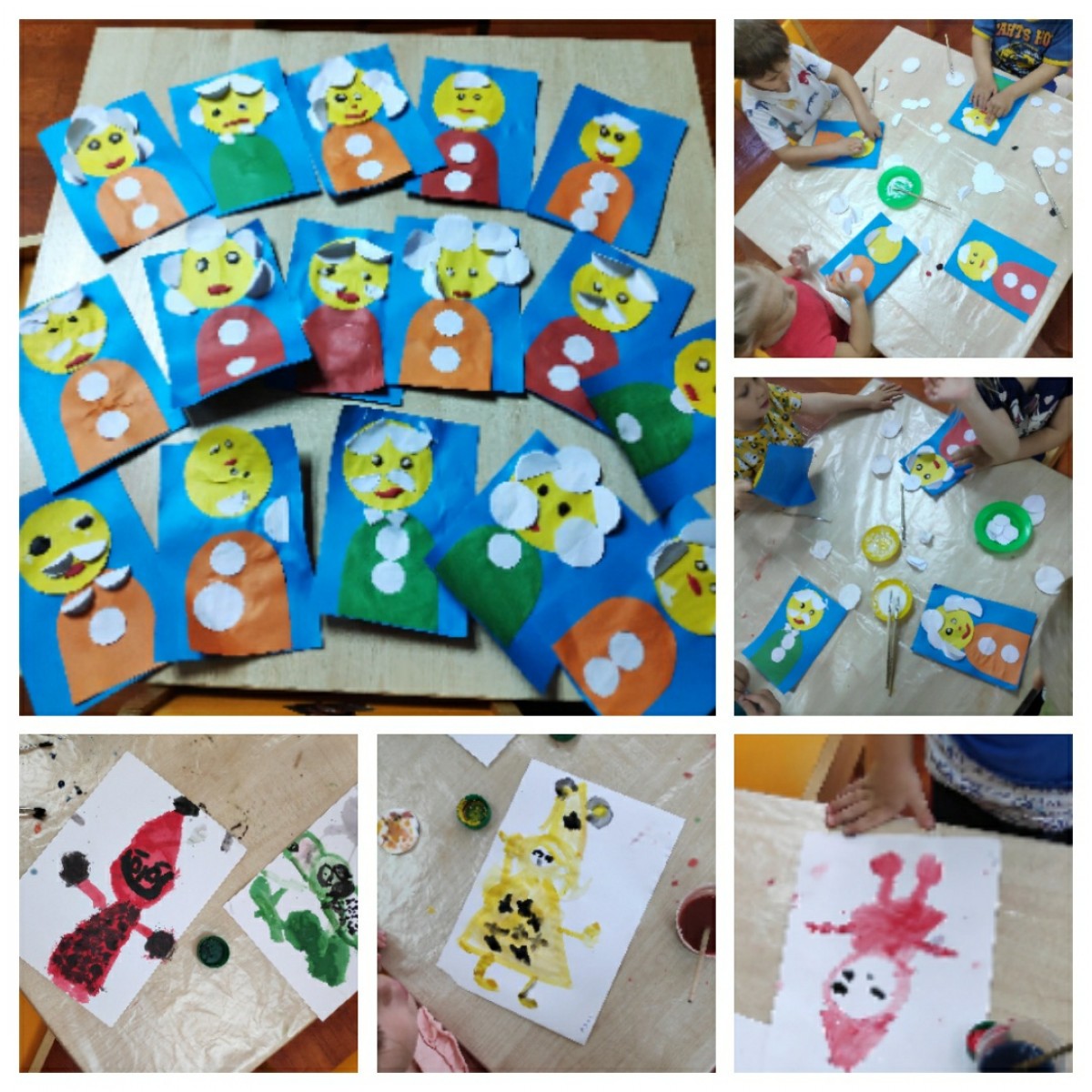 Выполнили аппликацию ко дню Пожилого человека. Рисовали забавных гномиков в колпачках, учились составлять изображение из простых частей. Круглая голова, конусообразная рубашка и треугольный колпак.